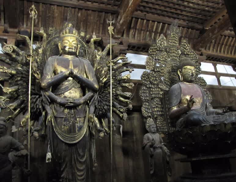 そして次に金堂に入る。全て国宝だという仏像がずらりと並ぶ。しかもかなり大きい。一瞬、京都の東寺の講堂・金堂内の仏像群を連想した。あっけにとられて見入ってしまう。盧遮那仏、千手観音等あるが、特に千手観音は、通常なら手一本あたり25本分の役割を果たすということで、実際には40本あまりというのが多いが、この千手観音は本当に約1千本ある。確かに見ていても壮観と言える。かつて解体修理された時の写真が掲示してあって、本体の周りに千本の腕の部分が並べられていた。組み立てるときも結構を大変だったろうと思われる。