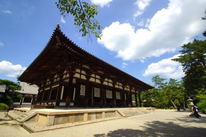 山門を入って真正面に国宝の金堂が目に入る。先にとりあえず境内全域を回ってみた。蓮の群生地や鑑真和尚の精密なレプリカが安置されたお堂、小さな森をくぐり池を渡って、伽藍が並ぶ中心地に戻ってきた。