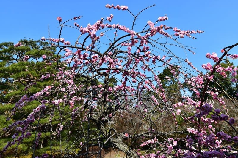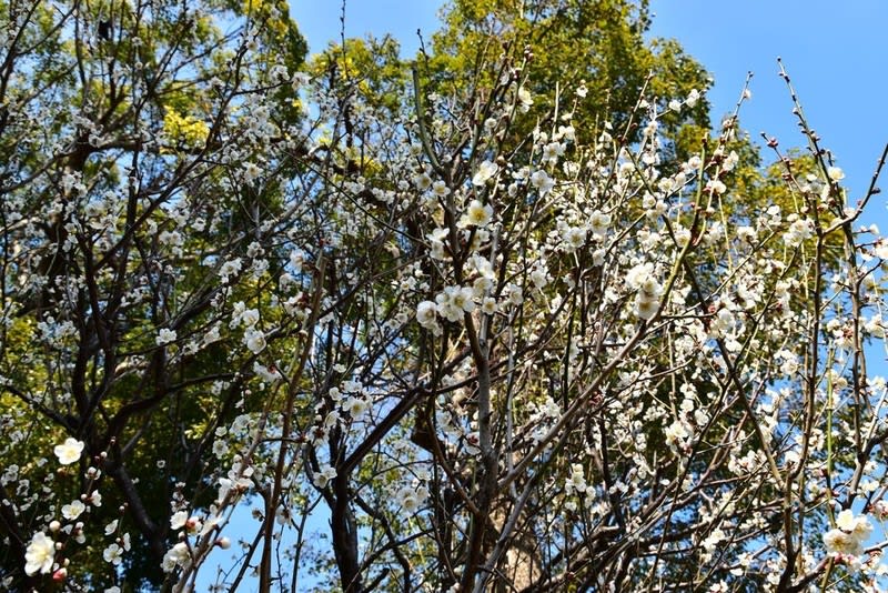 満開の梅が密集して壮観だろうとイメージしていたが、入った瞬間、ものの見事に裏切られてしまった。全体的に開花は少なく、帰ってから確かめた通り、五分咲きも行っているかどうかの状態だった。正直ガクッときた。まあそれでも樹木によっては七分から八分も咲いている梅もあって、それはそれで良かったのだが、梅宮大社の梅は庭園全体が、赤と白、桃色で埋め尽くされるほどの見事な咲きっぷりにある。そこからするとはるかに及ばない。