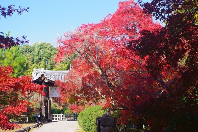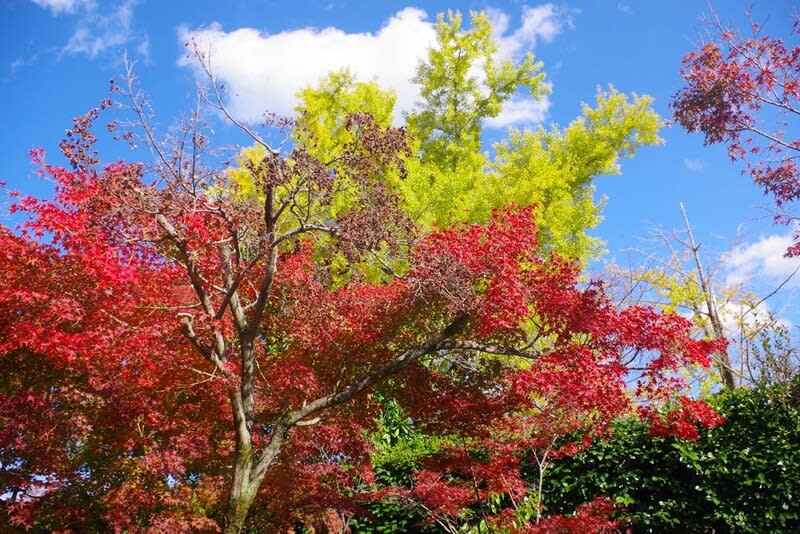 山科区の勧修寺。とても行きやすい場所にあるので今まで何度も何度も訪れている。年間通して様々な花々が咲き誇り、どのシーズンに行っても季節にあった花が咲いていて満足できるところだ。しかし自分の記憶の中では、勸修寺の紅葉もブログにアップしていると思っていたが検索しても見当たらない。ひょっとして紅葉はまだだったのかとも思ってみたが、 どうも不明だが検索から外れてしまうようだ。ただ久しぶりのことには間違いない。鮮やかな赤い色が境内全体を覆っており、特に京都市の名勝庭園に指定されている広い 池のある 境内は、ベンチに座ってゆっくりとくつろげる場ともなっている。そんな中で青空の好天、そして赤いもみじ、黄色のイチョウ。これらが相まって絶好の撮影日和 となった。